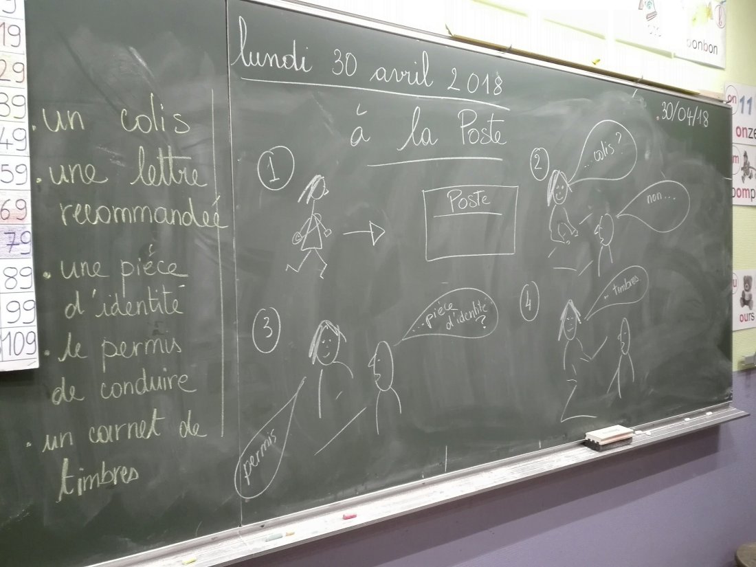Chacun écrit sur son cahier de brouillon./ Une dame va à la Poste. Elle va chercher un colis. Mais, ce n’est pas un colis, c’est une lettre recommandée. L’employé demande une pièce d’identité. Elle a son permis. Elle demande un carnet de timbres pour la France et deux timbres pour le Sri Lanka. /C’est une réussite. BONHEUR 🙂 - « Maintenant, vous allez venir écrire votre adresse au tableau, comme sur une enveloppe. » Ahmed M. écrit l’adresse d’une association. Ahmed El. connaît. Il lui demande s’il est hébergé là-bas. Ils parlent tous les deux arabe, mais ils communiquent en français dans la classe. Ahmed M. lui explique que c’est juste pour recevoir son courrier, qu’il n’habite pas là. Kumail écrit le nom de sa rue avec quelques hésitations et Orlando trace les lettres de son adresse d’une belle écriture.
