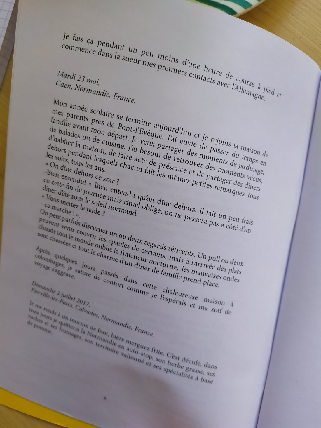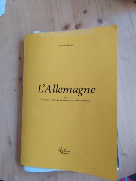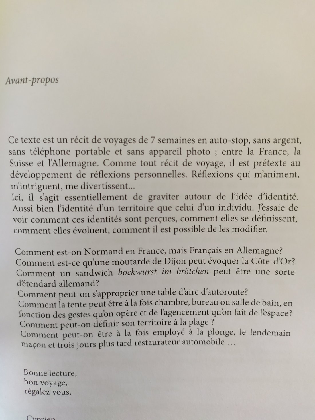 Je leur présente la première page du récit de voyage en auto-stop, auto-édité, d’un étudiant, Cyprien Desrez, jusqu’en Allemagne, sans argent ni téléphone.