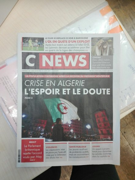 » Alice, on peut lire un peu le journal gratuit du métro ? Comme ça, on apprend des choses sur l’actualité. Par exemple, là ils parlent de l’Algérie et je ne comprends pas ce qui se passe. »