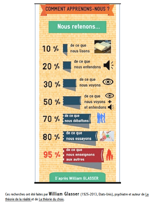 Edgar Dale et William Glasser sont d’ailleurs assez d’accord sur la question. Je n’ai pas encore fait de recherches approfondies sur eux, mais cela me semblerait intéressant.