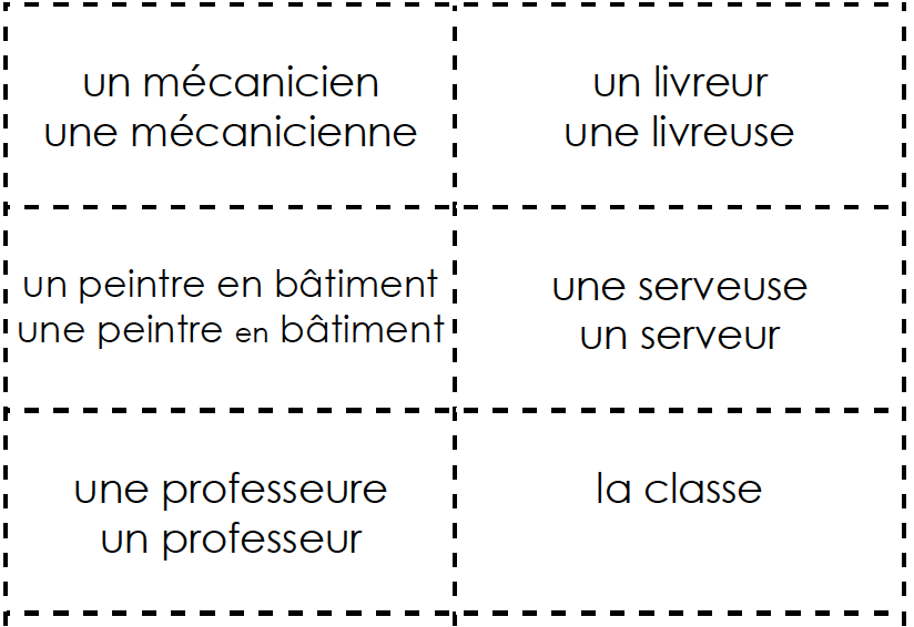 Les apprenants doivent faire les correspondances, ensemble, en même temps, tranquillement, sans tour précis, en collaborant : » Je cherche le mécanicien, tu l’as ? … ah oui, là … tiens «