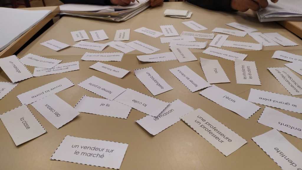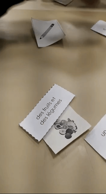 Chaque apprenant a un tas d’étiquettes-images. Les étiquettes-mots/phrases sont toujours étalées sur la table.