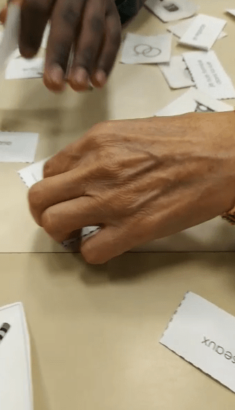 Voici une activité très progressive, très rassurante, pour des apprenants peu scolarisés, qui les mènent vers l’autonomie, en passant par la répétition et la coopération. Les étiquettes sont ensuite rangées dans la mallette pédagogique et peuvent être réutilisées, encore et encore, par les apprenants.