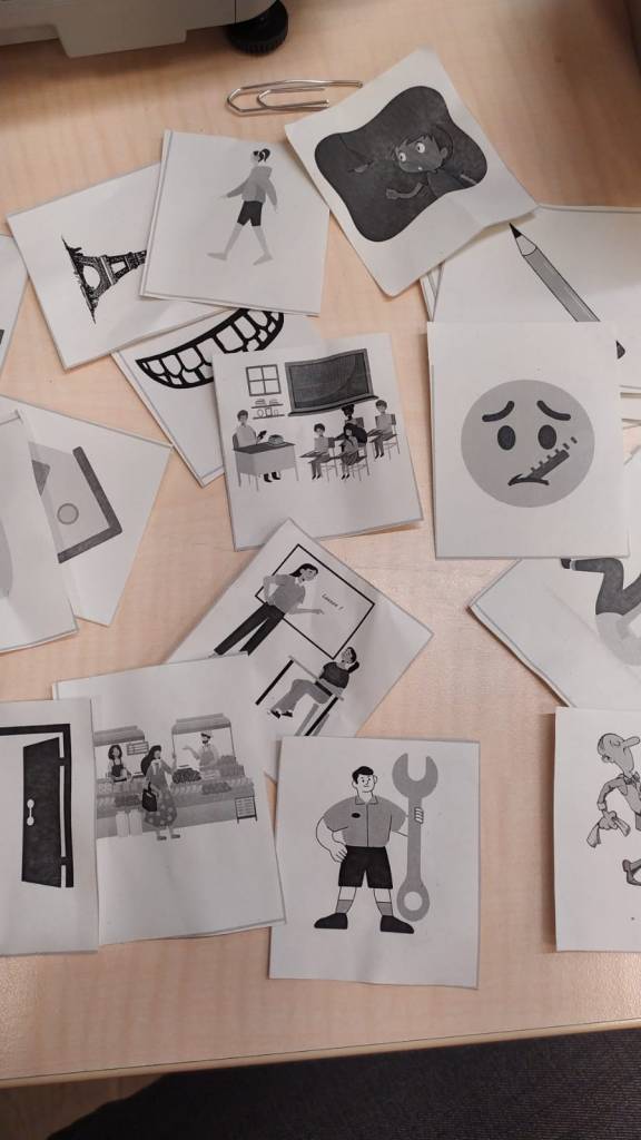 Sur une table, les étiquettes-images sont en tas, sur une autre les étiquettes-mots/phrases sont étalées, bien visibles.